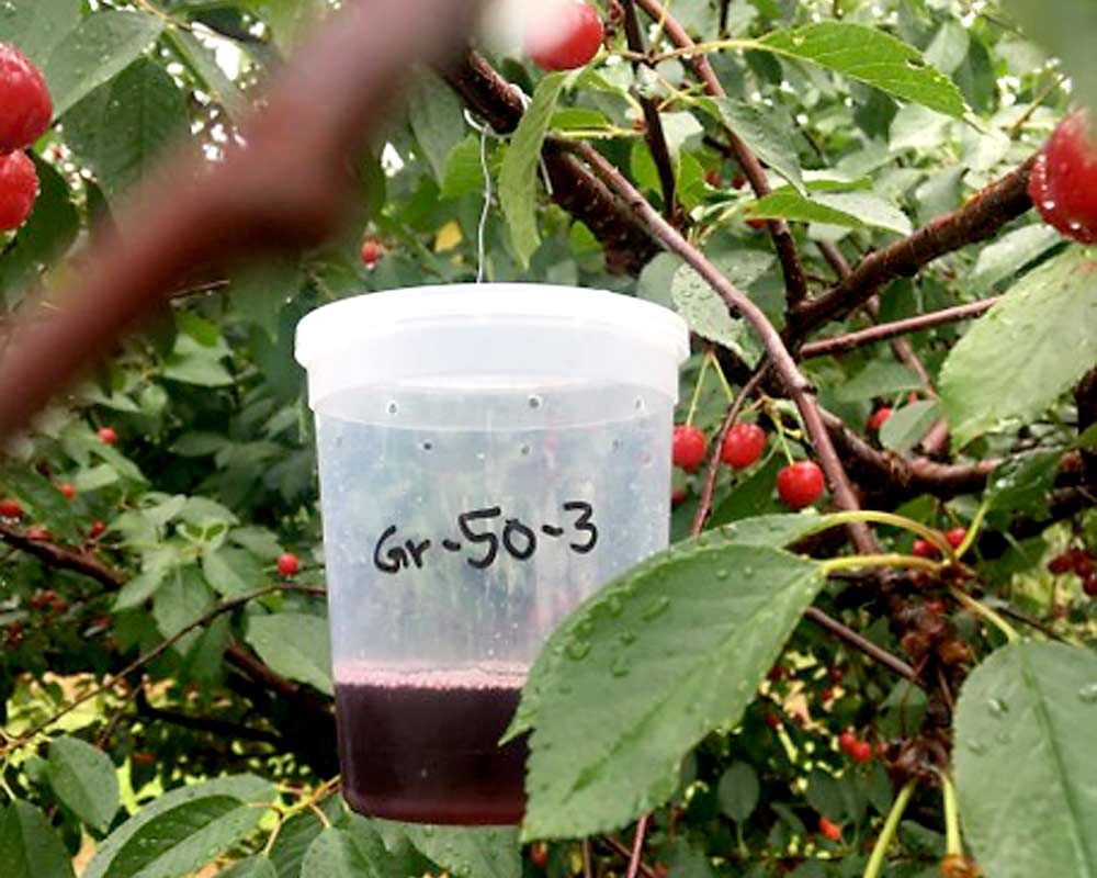 A Massachusetts Egyetem kísérleti ültetvényeiben cseresznye és őszibarack blokkokban hasonlította össze a különböző csapdákat, amelyeket Concord szőlőfajta hígított levével, illetve különböző csalétkekkel együtt használt.