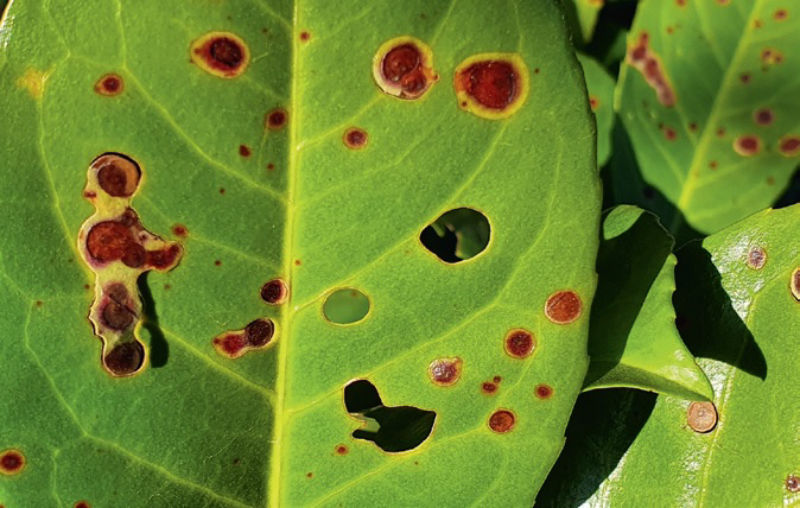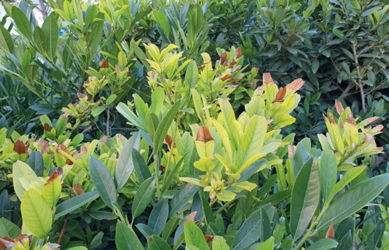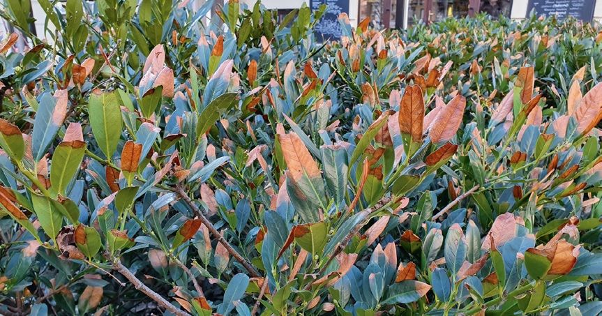 Február közepén jött idén az első megkeresés, nézzek meg egy budai szobor mellett található többéves babérmeggy-kiültetést. A látvány nem ért váratlanul, erősen tömörödött, szemetes talajon, sérült öntözőrendszer fölött szorosan zsúfolódtak a növények. A friss hajtások sárguló levelei a nitrogén, a zölden maradó erek pedig a nem mobilizálható vas hiányára utaltak. Az idős levelek csúcsszáradását látva viszont elbizonytalanodtam. A leveleken látható, átmenet nélküli barnulás, az egészséges zöld résztől élesen elváló száradás okát nem találtam meg a helyszínen. A levélhullás is elgondolkodtatott, ezért mintát vettem és azt elvittem Vajna Lászlónak, aki a minta laboratóriumi vizsgálata után fölkereste a helyszínt, sőt több budapesti kiültetést is megvizsgált. Idézek a szakvéleményéből.
