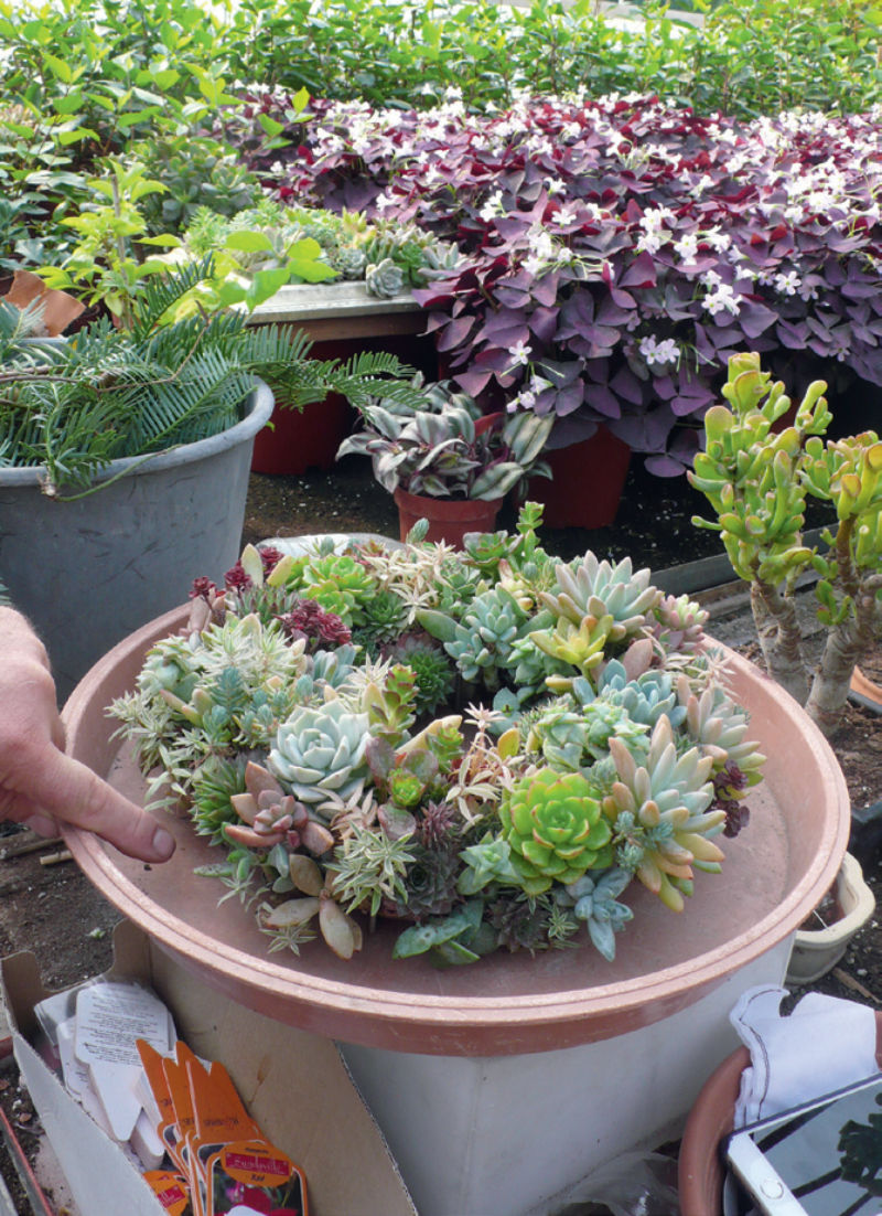 Az acél koszorúalapba egy saját összeállítású földkeverékkel megtöltött, fátyolfóliából varrt „hurkát” rögzítenek, majd abba saját nevelésű apró pozsgás növényeket ültetnek. Öntözéséhez vízben fölszívatják a földkeverékkel teli koszorúalapot, a túlnőtt pozsgásokat pedig egyszerűen lecsipegetik. A növényzet gyorsan benövi, eltakarja az alapot, dús, zárt élő növénykoszorút alkotva a pulton igen látványos, vásárlásra csábít.