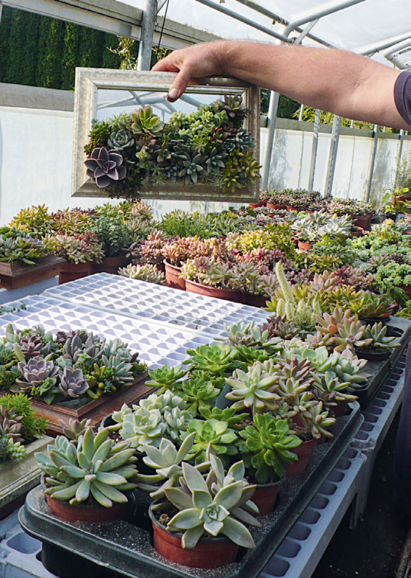 Széles képkeretbe vakondhálót rögzítenek, az tartja össze a mögé ültetett, különböző színű pozsgás növényeket. A szelestei fóliaházban nevelt változatos színű és lombozatú növények állandó alapanyagot szolgáltatnak a képekhez és a koszorúkhoz is.