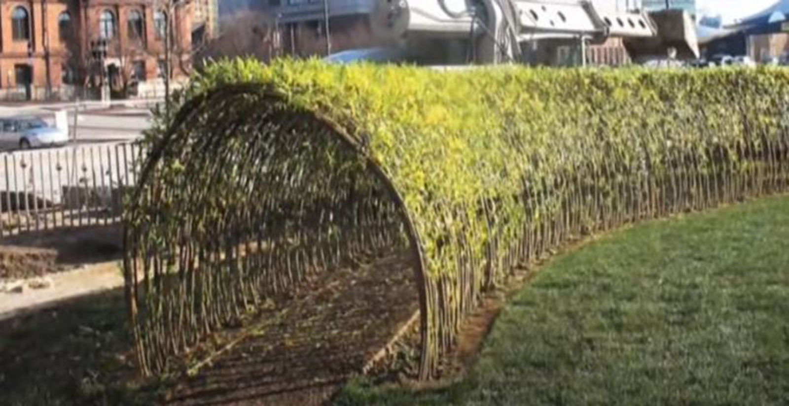 Így kevesebb fűzvesszőt kell felhasználnunk, és a stabilan álló vasszerkezet is rejtett lesz. Az ültető gödröket a kötegek behelyezése előtt locsoljuk be. Ha megszikkadtak, a felállított oszlopok tövét ássuk a helyükre, és locsoljuk be még egyszer. Figyeljünk arra, hogy a tömörítés megfelelő legyen, mert a köteg könnyen kidőlhet a helyéről. A tömörítés a gyökeresedés miatt is fontos, hiszen csak akkor fog jól gyökeresedni a fűz, ha a nedves föld érintkezik a vesszőkkel. A terveknek megfelelően kössük össze az oszlopokat dróttal vagy erős kötéllel a megfelelő pontokon.
