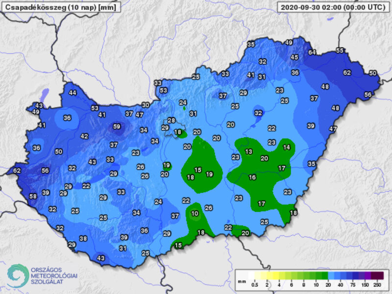A Dunántúlon és az északkeleti határszélen esett a legnagyobb mennyiség, 20-45 mm, míg a Dunától keletre 5 és 20 mm közötti összegek voltak jellemzőek. Vasárnap átmeneti szárazabb időjárás után hétfőn hajnaltól ismét sokfelé eredt el az eső, és a Dunántúlon, valamint északkeleten újabb 5-15 mm csapadék esett.