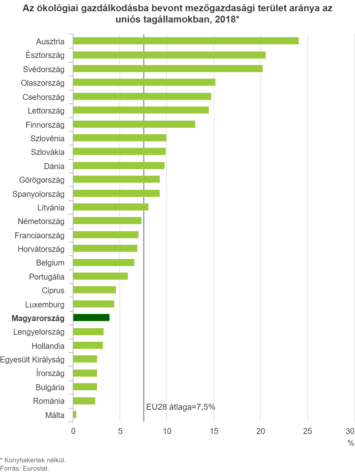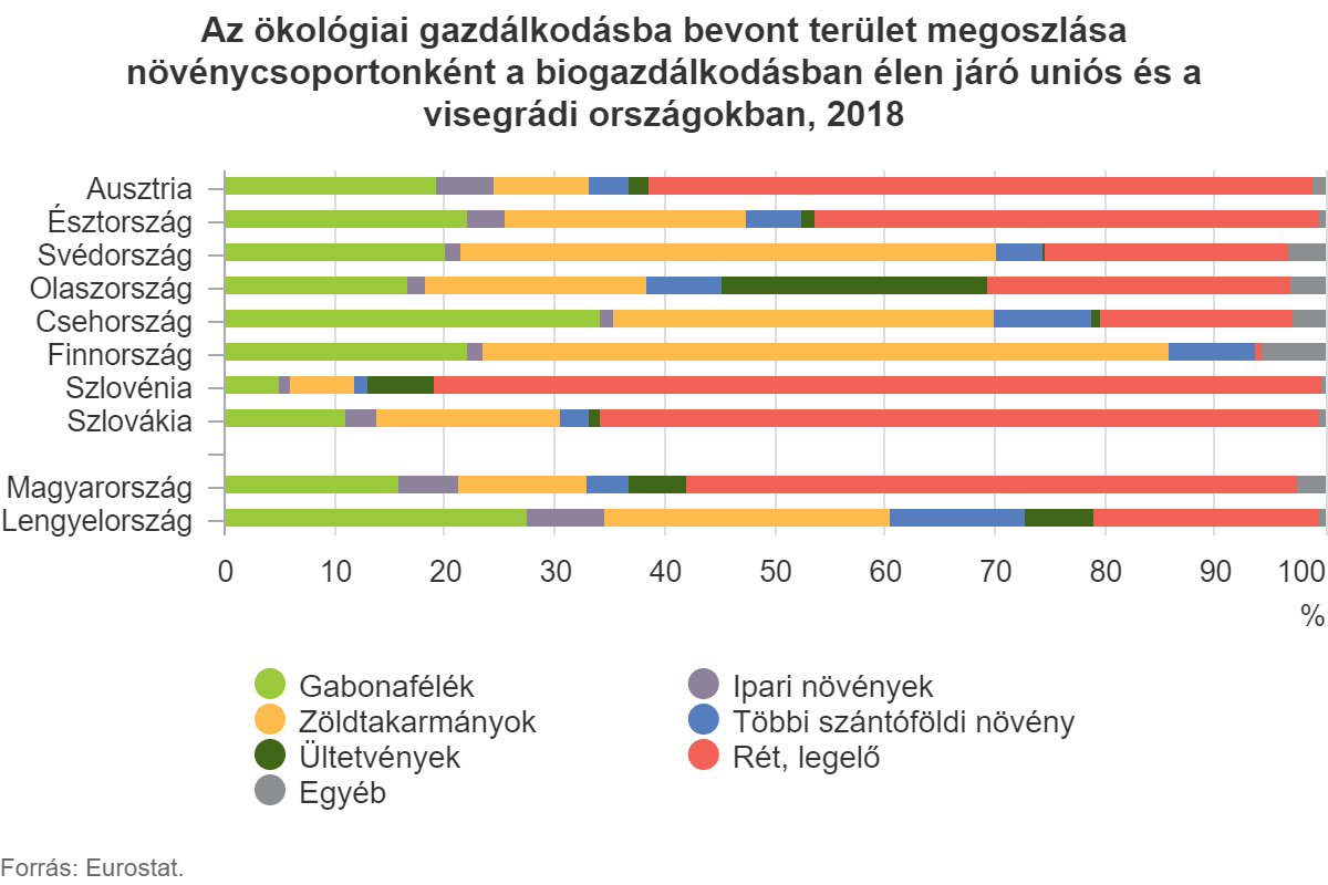 Az ökológiai gazdálkodással érintett mezőgazdasági területek részesedése Ausztriában volt a legnagyobb (24%), az uniós átlag háromszorosa. Az arány további 7 tagállamban haladta meg a 10%-ot, a visegrádi országok közül egyedül Csehország (15%) tartozott ebbe a csoportba. Hazánk 3,9%-kal a 21. helyen volt az uniós rangsorban. A visegrádi országok közül Szlovákiában a magyarországinál nagyobb (9,9%), Lengyelországban kisebb (3,3%) volt a biogazdálkodásba bevont agrárterületek előfordulása.