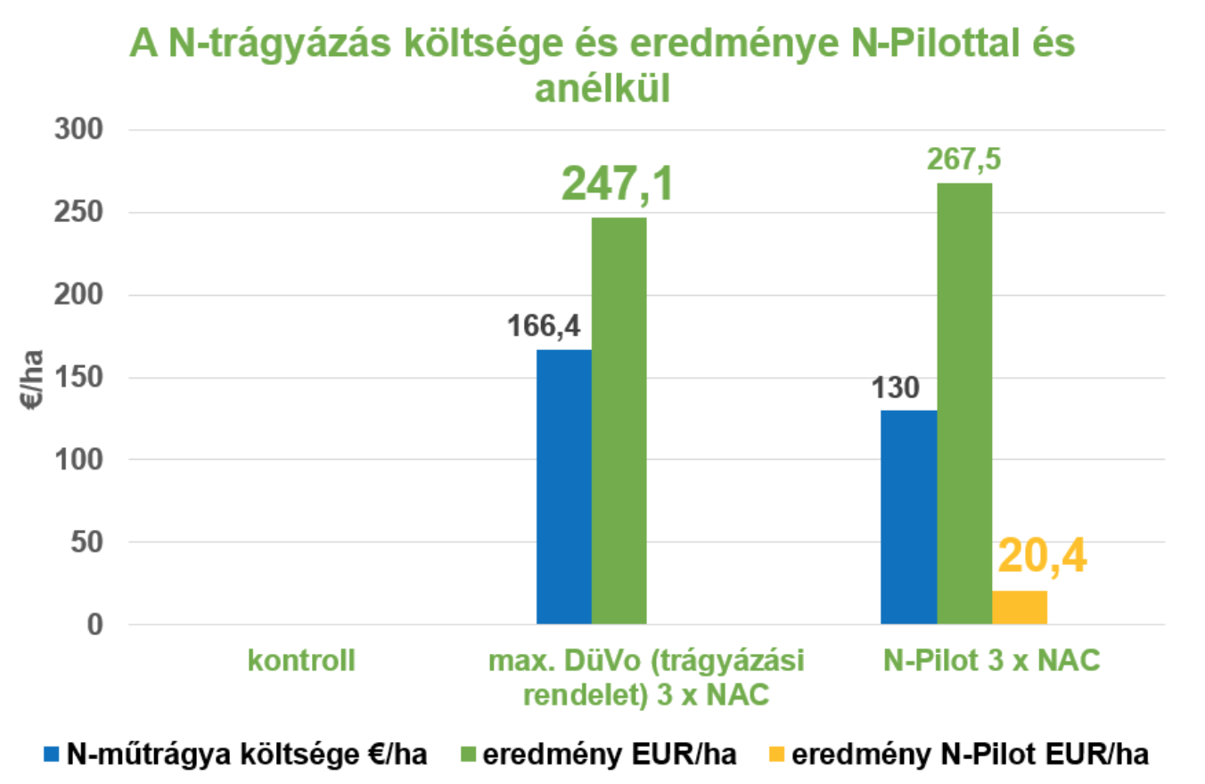 Az őszi búzán végzett helyszíni vizsgálatok azt mutatják, hogy az érzékelők felismerik a N-igényt, és ennek megfelelően tesznek ajánlást a műtrágyázás mennyisége és kijuttatási ideje szempontjából. Az Észak-Rajna-Vesztfália Mezőgazdasági Kamara által végzett kísérletben a búza trágyázását a műtrágya-rendelet (Düngeverordnung, DüVo) szerint megengedett legmagasabb mennyiséggel, 192 kg N/ha-ral (max. DüVO) végezték; ezenkívül az N-Pilot ajánlása szerinti trágyázásra is sor került. A kézi érzékelő készülék mérése szerint csak 150 kg N/ha volt az ajánlott mennyiség a helyszíni adottságok alapján, vagyis 42 kg N/ha megtakarítást értek el a műtrágya mennyisége tekintetében. A 10,7 t/ha hozam közel megegyezett a maximális változat értékével (10,8 t/ha). A 13,7%-os nyersfehérje-tartalom is alig különbözött a maximálisan megengedett N-trágyamennyiséggel (14%) kezelt változattól. Az N-Pilot szerinti műtrágyázásnál a megtakarítás 20 EUR/ha volt ebben a kísérletben. 250 hektár búzaterület mérésekor a készülék beszerzése már megtérült. (1. ábra).