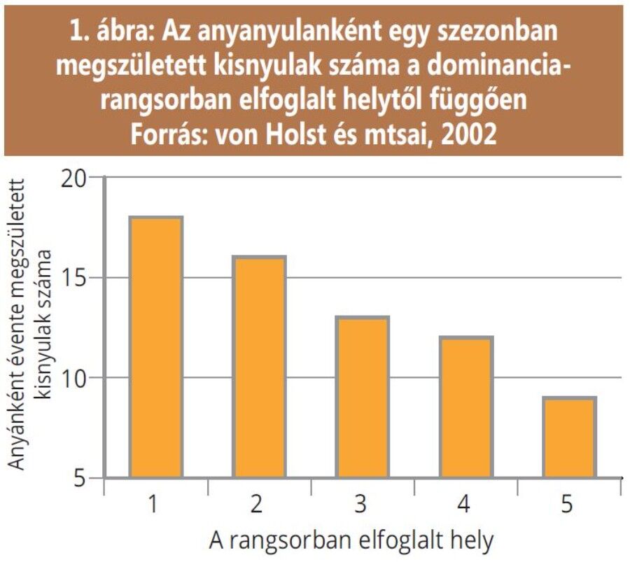 Gondoljunk bele a csoportosan tartott házinyúlanyákra, mekkora lehet közöttük a stressz és ennek a negatív hatása! Ha egy csoportban két üregi anyanyúl helyett hat volt, akkor az év eleji agonisztikus viselkedés 3,3-szor gyakoribb lett. A csoporton belüli rangsor is alapvetően meghatározza az üregi nyúl szaporaságát. A domináns üregi anyanyulak jobb helyre készítik a fészket, tavasszal hamarabb fialnak, ezért esetükben hosszabb a szaporodási időszak. Kisebb a magzati élet alatti mortalitás, nagyobb almok születnek. Megszületés után a kisnyulak több tejhez jutnak, jobban gyarapodnak, elválasztáskor jobb kondícióban vannak, és emiatt az elválasztás utáni túlélési esélyük is jobb. Ezzel szemben a rangsor 4-5. helyén álló egyedek a domináns anya teljesítményének 73%-át érik el, ha pedig a felnőttkorig életben maradt ivadékok számát vették figyelembe, akkor ez az érték csak 22%. A rangsor 1. helyén levő anyanyúlhoz képest az 5. helyen levő fele annyi kisnyulat hoz világra (1. ábra).