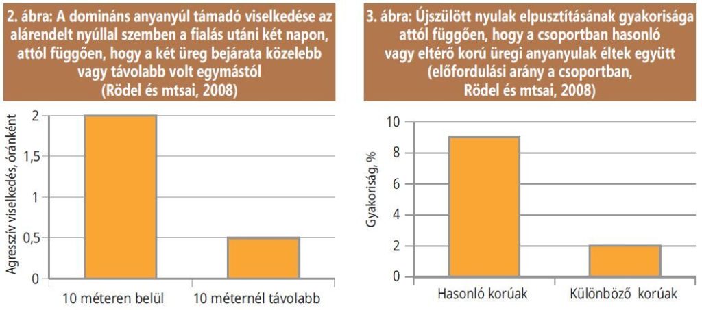 Ennek része lehet a másik anya ivadékainak elpusztítása is. Az újszülött, néhány napos szopós nyulak megölését üregi nyulaknál is megfigyelték. Ez általában a teljes almot érinti (a 43%-os alompusztulás 12%-a), 40%-ban a fészket is tönkreteszik, és 14%-ban egy másik anya fial ugyanabba a fészekbe, míg 36%-ban egy szomszédos üregben hozza világra ivadékait. Kiegyensúlyozatlan populációban (ahol hasonló korú anyanyulak élnek együtt) gyakoribb az újszülöttek megölése, mint kiegyensúlyozottabb (különböző korú anyanyulak) esetén (3. ábra). Egy csoportba általában különböző korú (egy-, két- és többéves) anyanyulak vannak, az idősebb a domináns, a fiatal az alárendelt – stabil a dominancia-sorrend, ritka a verekedés. Ha viszont az anyanyulak hasonló korúak, gyakoribb a verekedés, ezáltal nem stabil a csoport és változik a dominancia-sorrend, emiatt a stressz-szint is magasabb. Házi nyulaknál szinte lehetetlen jelentősen eltérő korú anyanyulakból összeállítani a csoportokat, a hasonló korúak között pedig gyakori az agresszív viselkedés, a verekedés, sőt, ha egymás elletőládájába bejutnak, még az újszülöttek elpusztítása is.