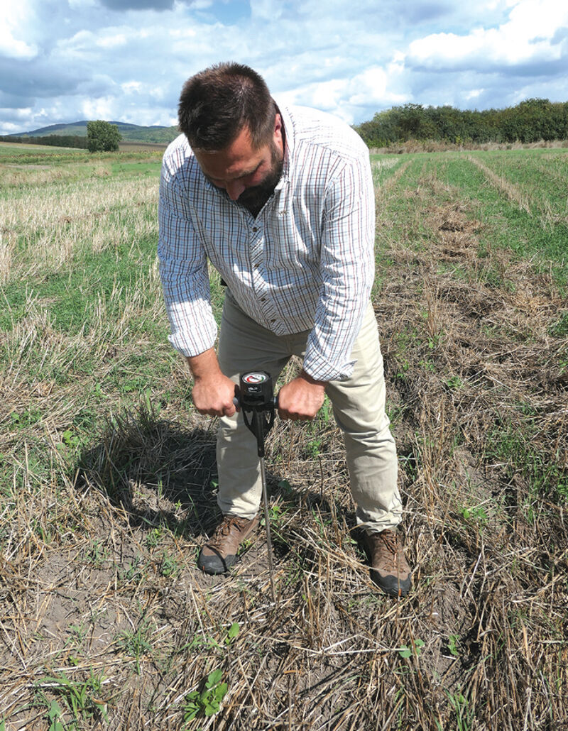 A takarónövényzet nagy előnye, hogy változatos gyökérrendszerével javítja a talaj szerkezetét: nem tömörödik, nem levegőtlenedik a föld. Ezt penetrométerrel lehet vizsgálni, ami mindig ott van Hajas Péter Pál kocsijában. Bármerre jártunk, rögtön előkapta és mért vele. Arra volt kíváncsi, hogy nem túl nagy erővel – amíg a műszer mutatója a zöld zónában marad – milyen mélyre tudja lenyomni a penetrométer hegyét.