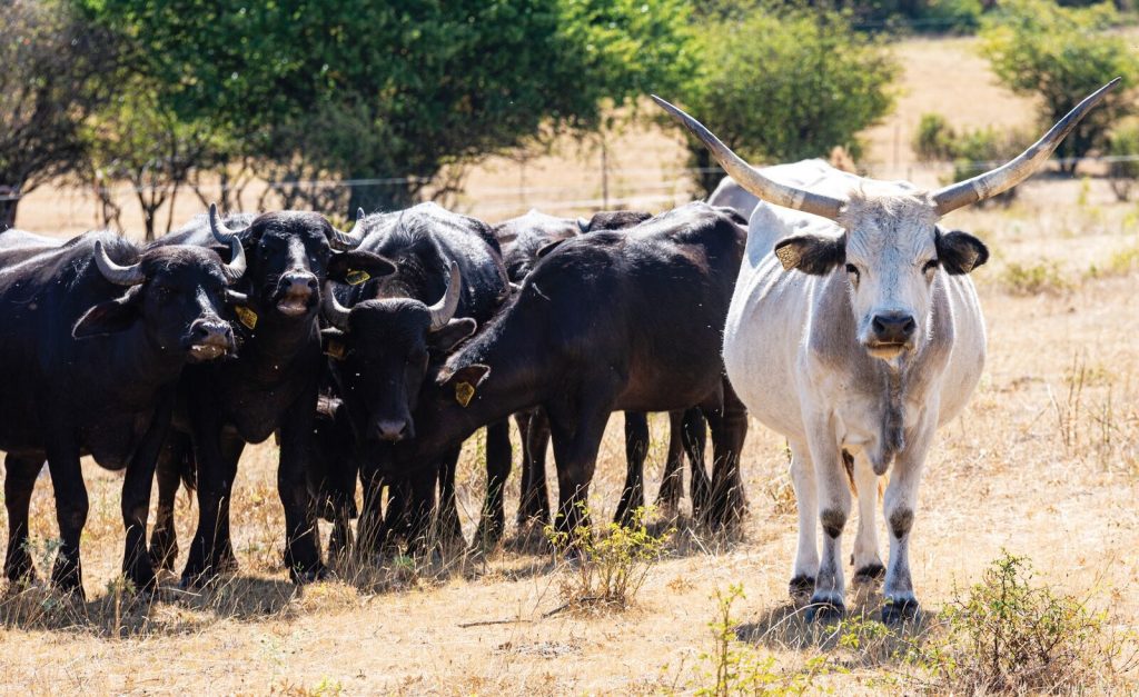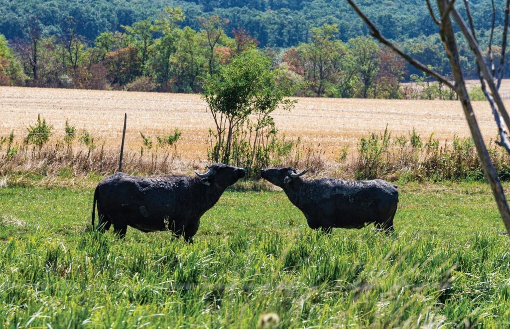 A szürkemarhák között feltűnik néhány bivalyborjú, amelyek csoportba tömörülve, kíváncsian bámulják a látogatókat, azaz minket. A felnőtt bivalygulya azonban lejjebb, a Rovákja-patak körüli zsombékos réten delel. Szeretik a kákát, a sást, a gyékényt. Télen szükségük van szélvédett helyre, nyáron pedig árnyékra, mivel feketék, de a tökéletes helyet a víz jelenti számukra. A patak vékony medréből a fejükkel túrnak maguknak medencét, amiben időről időre alámerülnek, akárcsak a vízilovak.