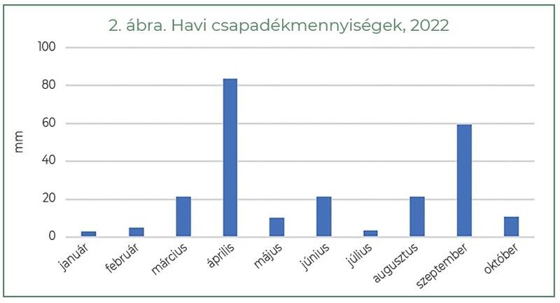 Ez önmagában is kevésnek számít, de ha megnézzük az eloszlást, látható, hogy ebből 83,6 milliméter áprilisban esett (2. ábra). A helyzetet tovább súlyosbította, hogy akkortájt volt a beporzási időszak is, és a méhek lényegesen kisebb mértékben tudták csak beporozni a virágokat. Májustól augusztus végéig összesen 77,2 milliméter csapadék hullott, több alkalommal felhőszakadás és jégeső formájában. Az éves csapadékmennyiség jelentős része alig pár nap leforgása alatt esett. Továbbá ebben az időszakban gyakori volt az extrém meleg is, többször rendeltek el hőségriadót, és az általunk regisztrált hőmérséklet a 40 °C-ot is elérte.