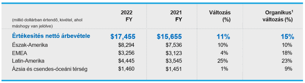 A 2022. december 31-én zárult negyedik negyedévben a nettó árbevétel 10%-kal nőtt az előző év azonos időszakához képest. Az organikus1 árbevétel 11%-kal nőtt, ami Latin-Amerikának és Észak-Amerikának köszönhető.