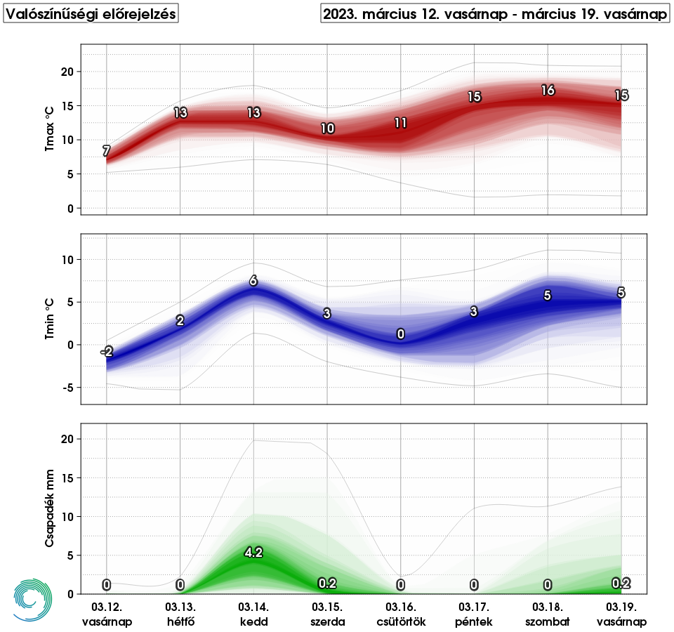 A folytatásban is időjárási frontok sorozata okoz változékony időt. Pénteken sokfelé, szombaton eleinte délen és keleten lehet eső, zápor, majd a nap második felében északkeleten akár hózáporok is előfordulhatnak. Vasárnap és hétfőn száraz időre van kilátás, de kedden nyugatról kelet felé haladva ismét egyre többfelé ered el az eső, és nemzeti ünnepünkön is lehetnek záporok. Összességében a következő egy hétben a maival együtt 2-15 mm közötti csapadék várható a gyakran záporos jellegből adódóan elég nagy területi változékonyság mellett. A már régóta száraz középső és északi területeken is sokfelé valószínű 2-5 mm közötti, helyenként 10 mm fölötti eső. A hőmérséklet pénteken még a maihoz hasonlóan 15 és 20 fok körül alakul, majd szombaton egy hidegfront hatására több fokkal visszaesik, és a hétvégén 10 fok alatti maximumok lesznek jellemzőek. A fagypont alatti hajnalok vasárnap és hétfőn térnek vissza, majd hétfőn ismét melegedés kezdődik, és egyre nagyobb területen melegszik napközben 15 fok közelébe a levegő. A szél szombaton nagy területen fokozódik viharossá, és a vasárnapi átmeneti mérséklődés után hétfőn is sokfelé lesz erős.