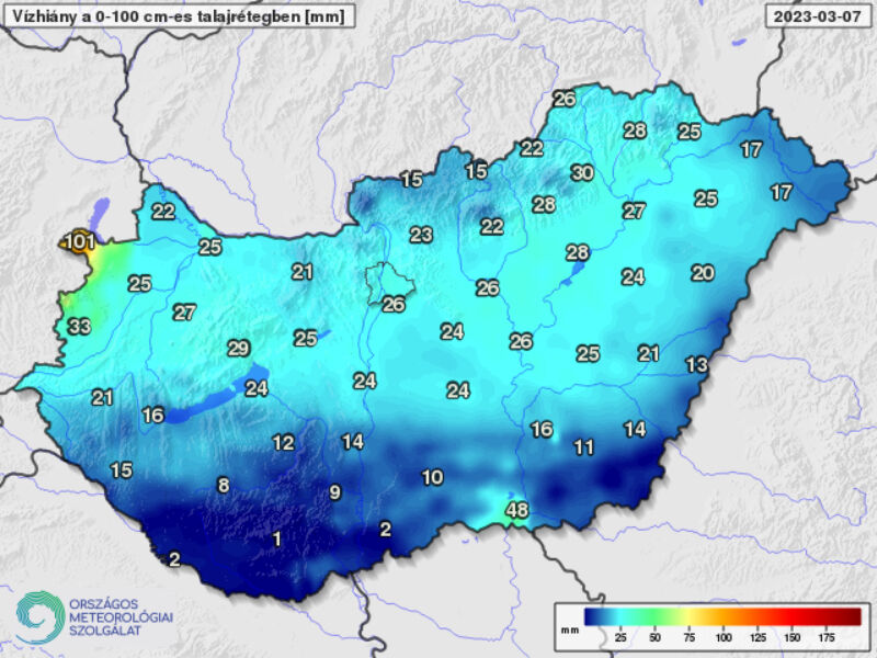 Számottevő csapadék a múlt csütörtökön a délnyugati országrészben hullott, majd a hét utolsó napjaiban országszerte száraz idő volt az uralkodó, annak ellenére is, hogy szombatról vasárnapra éjszaka egy markáns hidegfront vonult át fölöttünk. Hétfőn és kedden az ország déli harmadán újabb 3-13 mm közötti mennyiségű eső esett, a középső és az északi országrészben azonban az 1 mm-t sem érte el az elmúlt 10 nap csapadéka. A 30 napos csapadékösszeg is országszerte alacsonyabban alakult az ilyenkor szokásosnál, a déli tájakon 20 mm alatti ez a hiány, míg máshol 25-35 mm-rel kevesebb esett a sokévi átlagnál.