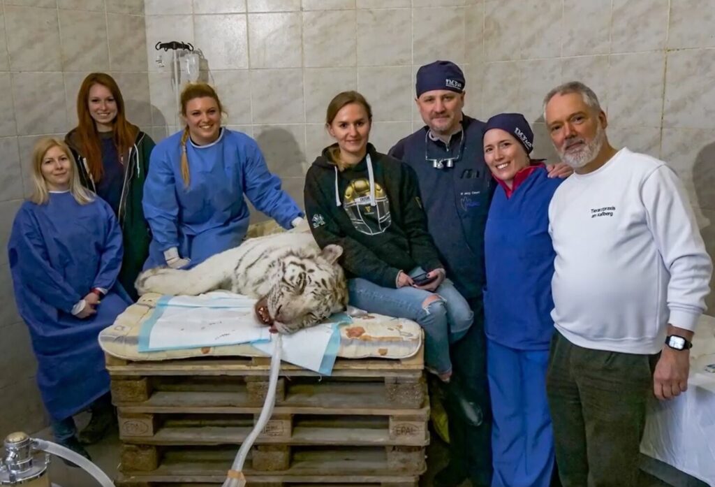 A szakmai felkészültséget igénylő műtét négy és fél órán át tartott. A specialisták minden fogról fogászati röntgent készítettek az állapotfelmérés részeként, és mind a négy sérült szemfogat foggyökérkezelték, így nem volt szükség azok eltávolítására. A fehér tigris már a kifutójában is látható és a korábbi takarmányt is szívesen fogyasztja.
