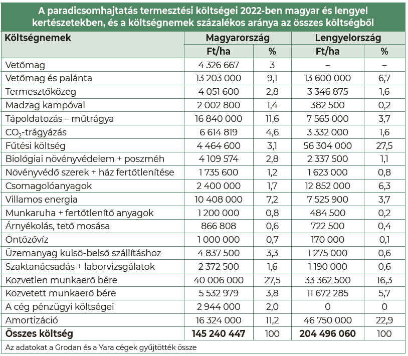 Az önkéntes alapon szolgáltatott adatokból vont átlagok azt mutatják, hogy a korszerű technikával, technológiával felszerelt paradicsomhajtató üvegházakban a hektáronkénti termesztési költség tavaly – amikor a legdrágább volt az energia és az inputanyagok – Lengyelországban mintegy 204,5 millió forint volt, itthon pedig 145,2 millió. A költségnemek összehasonlításából pedig az is kiderült, hogy mire kellett a legtöbbet fizetniük a kertészeknek.