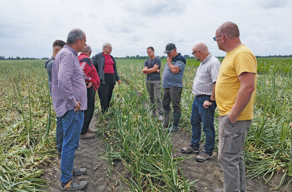 Az előadásokat követően a résztvevők két termelő területeit is meglátogatták a környéken. Az első helyszínen Hidvégi István elmondta, hogy feltehetően egy véletlennek, egy technológiai hibának köszönheti, hogy a hagymatáblájában alig látni virágzó egyedeket, tehát a hibából végül erény lett. Talajlazítás és magágy-előkészítés után áttelelő spenót helyére vetették a hagymát.