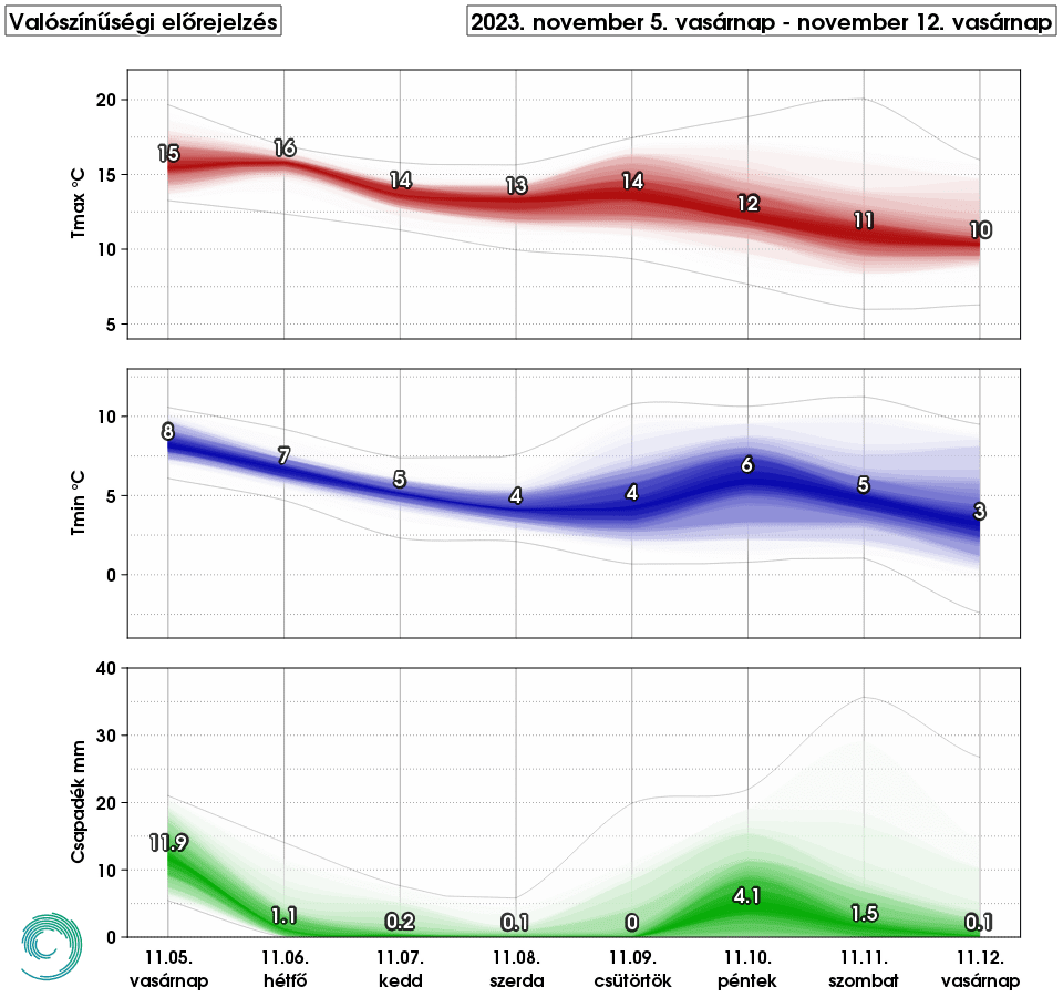 Már csütörtök estétől többfelé ered el az eső, majd pénteken egy kiterjedt ciklon hidegfrontja halad át fölöttünk nyugatról kelet felé, és szállít a Dunántúlra és a középső országrészbe 10-20 mm, a Tiszántúlra 2-8 mm csapadékot. Az intenzív záporokat zivatarok is kísérhetik, sokfelé a szél is megerősödik. Szombaton átmenetileg száraz időben lesz részünk több órás napsütéssel, majd vasárnap újabb frontrendszer okoz átlagosan 5-10 mm csapadékot eső, zápor, zivatar formájában. A jövő hét első felében csökken a csapadékhajlam, de helyenként ekkor is előfordulhat eső, zápor, a hét első napjaiban akár zivatar is.