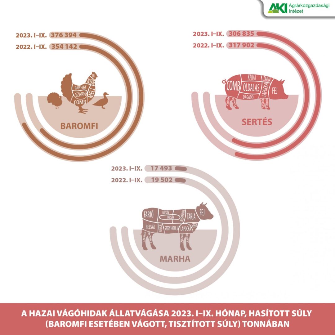 A levágott szarvasmarhák 63 százaléka tehén, 18 százaléka bika volt. A tehenek vágása 9,5 százalékkal, a bikáké 15,3 százalékkal csökkent, míg az üszők vágása 5,8 százalékkal nőtt a darabszám alapján 2023 első három negyedévében a bázisidőszakhoz képest. A sertésvágáson belül az anyakocák vágása az előző év első három negyedévi 50,7 ezerről – több mint 17 százalékkal – 41,8 ezer darabra csökkent a 2023. január–szeptemberi időszakban. A baromfi túlnyomó részét – darabszám alapján a 85 százalékát – a csirke tette ki, a pulykák számaránya 2,3 százalék volt, a kacsáké 10,1.