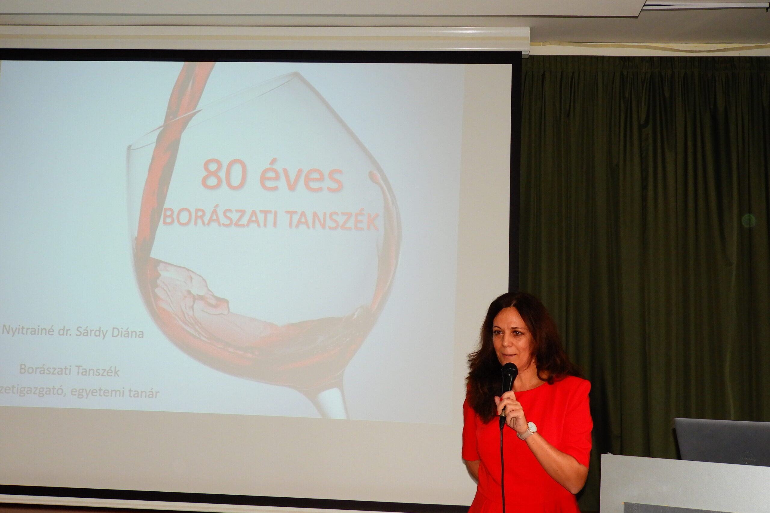 „Bár szeptemberben volt 170 éves a Budai Campus, decemberben is van mit ünnepelnünk”- kezdte köszöntőjét Nyitrainé dr. Sárdy Diána, egyetemi tanár Szőlészeti és Borászati Intézet intézetigazgató. A szakember kiemelte, a nagy múltú tanszék jelenlegi helyére 1945-ben került, s azóta is ott dolgoznak. Visszaemlékezésében elmondta, 1946-48 között az oktatás ideiglenesen a Hűvösvölgyi úton lévő Bólyai Katonai Akadémia épületében folyt, mivel a Ménesi út romokban hevert. Az intézmény ekkor már Agrártudományi Egyetem Kert- és Szőlőgazdaságtudományi Karként működött. A visszaköltözéssel egy időben jelent meg Requinyi professzor Borászat című könyve, amely az első tankönyv volt.