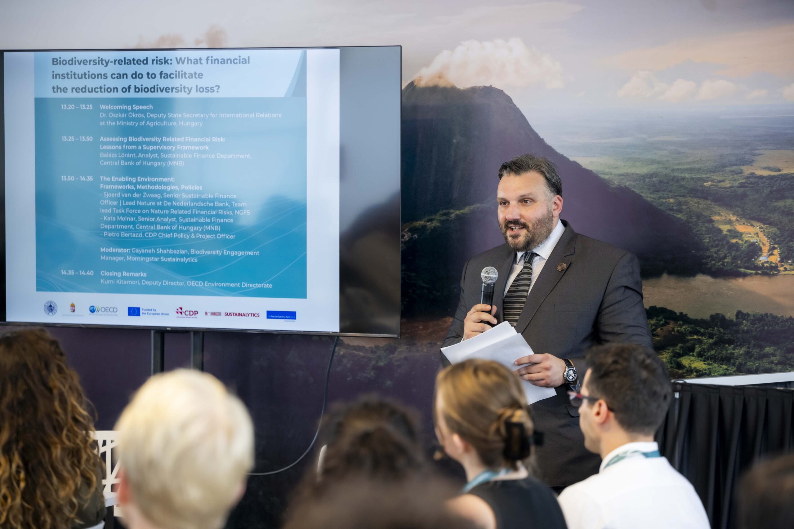 Ökrös Oszkár hangsúlyozta, a teljes globális GDP több mint fele a természettől és annak szolgáltatásaitól függ, ezért az élővilágra leselkedő kockázatok egyben pénzügyi veszélyt is jelentenek. Kiemelte, a három szervezet közös tanulmánya szerint az élővilágot sújtó sokkok következtében a GDP akár 4-7%-kal csökkenhet, a nem teljesítő hitelek aránya pedig 1-3%-kal nőhet. A helyettes államtitkár aláhúzta, hogy e felismerés alapján a magyar kormány komolyan veszi a biológiai sokféleség megóvását és a természetvédelem kérdését, ezért hazánk a világon az elsők között fogadta el 2030-ig szóló Nemzeti Biodiverzitási Stratégiáját, és az elmúlt tizenöt évben korábban nem látott mértékű természetvédelmi beruházást valósított meg. Ökrös Oszkár kiemelte, hogy Magyarország területének egyötöde védett és a kormányzati beruházok több mint 300 000 hektáron, a védett területek mintegy 15%-án javítottak az élőhelyek állapotán.
