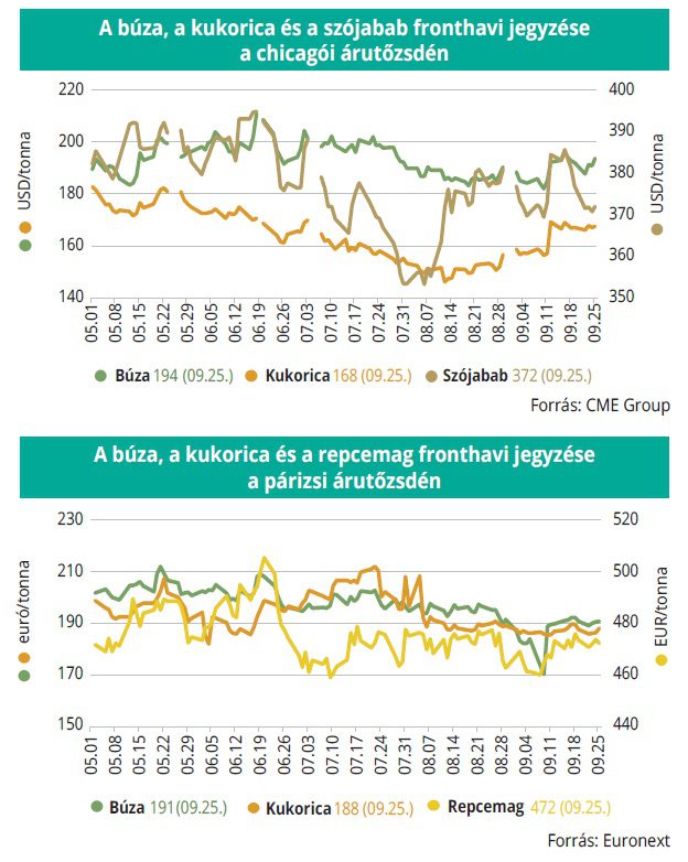 A chicagói árutőzsdén (CME/CBOT) a búza és a kukorica legközelebbi lejáratra szóló jegyzése 1-1 dollárral 194 dollár/tonnára, illetve 168 dollár/tonnára nőtt a megfigyelt időszakban. A szójabab fronthavi kurzusa 9 dollárral 372 dollár/tonnára csökkent ugyanekkor. A párizsi árutőzsdén (Euronext/MATIF) a búza és a kukorica legközelebbi lejáratra vonatkozó tőzsdei elszámolóára egyaránt 1,5 euróval volt alacsonyabb szeptember 25-én az egy héttel korábbihoz képest: az előbbit 191 euró/tonnáért, az utóbbit 188 euró/tonnáért jegyezték. Ezzel egy időben a repcemag novemberi kurzusa 471–474 euró/tonna között ingadozott.