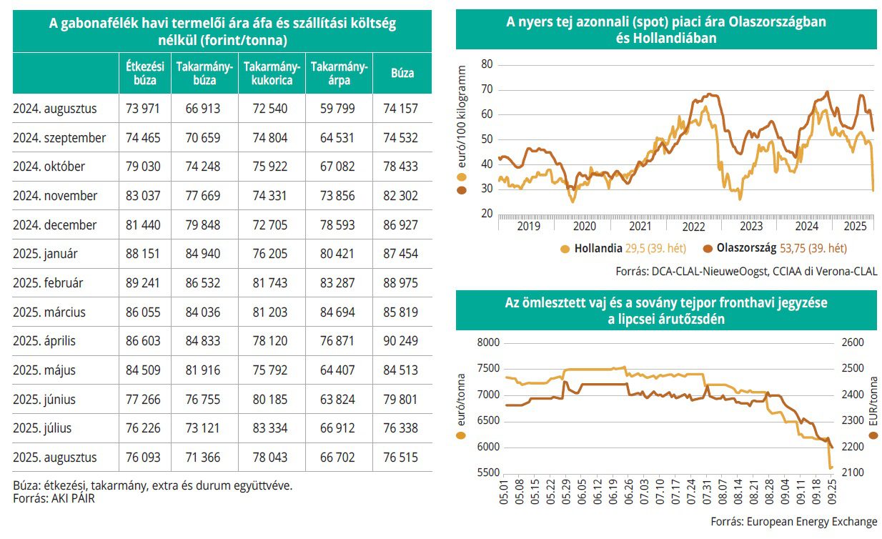 A lipcsei árutőzsdén (EEX) az ömlesztett vaj legközelebbi határidőre szóló jegyzése 530 euróval 5633 euró/tonnára, a sovány tejporé pedig 50 euróval 2200 euró/tonnára csökkent szeptember 18. és 25. között. Az olaszországi Veronában a nyers tej azonnali (spot) piaci ára áfa nélkül, szállítási költséggel a 29–39. hét között 14,25 euróval 53,75 euró/100 kilogrammra mérséklődött. Hollandiában a 4,4 százalék zsírtartalmú nyers tej spot piaci ára áfa nélkül, szállítási költséggel a 28–39. hét között 23,5 euróval 29,5 euró/100 kilogrammig ereszkedett.