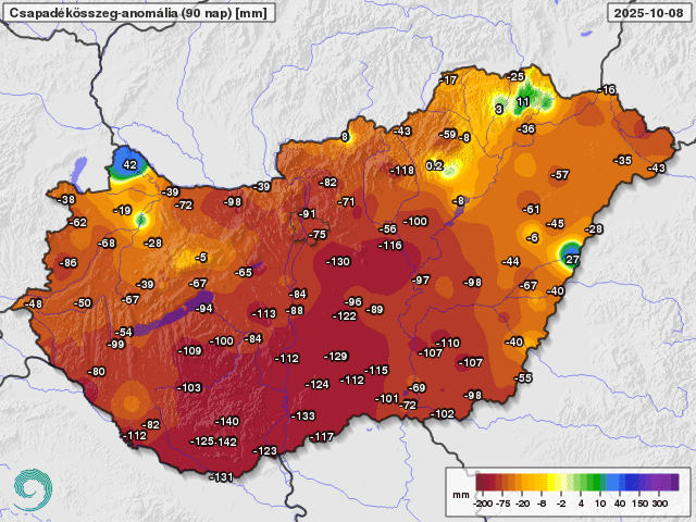 A 90 napos összegben pedig szinte az egész országban jelentős, mintegy 40-130 mm az elmaradás az átlaghoz képest. A talaj felszín közeli rétege sokfelé kellően nedves, de az Alföld déli részén nagy területen száraz. A 30-60 cm-es talajréteg is a Dunántúl nyugati felén és az északi országrészben tartalmaz bővebben nedvességet, míg 50-60 cm-nél mélyebben csaknem országszerte igen szárazak a talajok.