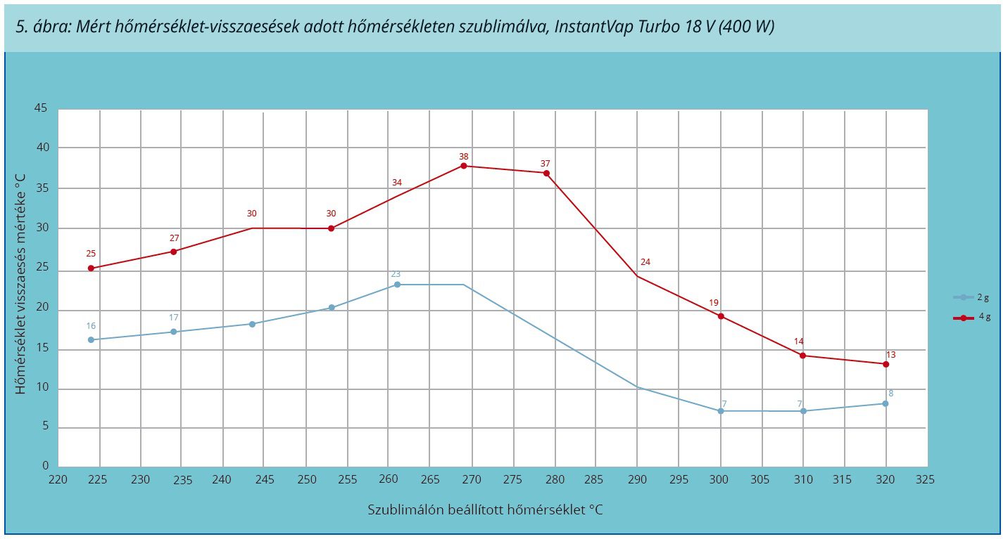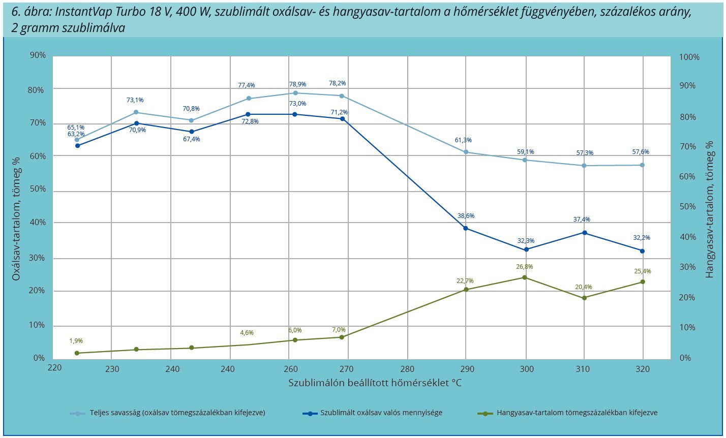 Vizsgálataink során teszteltük több gyártó készülékeit is, és gyakran előnytelen technikai megoldásokkal találkoztunk. Ezek egyike, ha az üst fűtőfelülete túl nagy az oxálsav által elfoglalt térfogathoz viszonyítva: ekkor az intenzívebb hőátadás a bomlásnak kedvez, így csökken a hatékonyság. A másik jellegzetes hiba, ha a hőmérséklet-érzékelő nem megfelelő elhelyezése miatt hamis értékeket mér. Így a mért, illetve kijelezett hőmérsékletnél az üst akár 50 fokkal melegebb lehet. Találtunk olyan készüléket, amelynek a hatékonysága nagy szórással 35 százalékos volt. A mérési adatok azt mutatják, hogy az alacsonyabb hőmérsékleteken még 2 százalék körüli hangyasavtartalom csak lassan növekedik 270 Celsius-fokig (7 százalék), majd gyors emelkedésbe kezd, és 290 fok felett már 20-25 százalékot ér el (6. ábra).