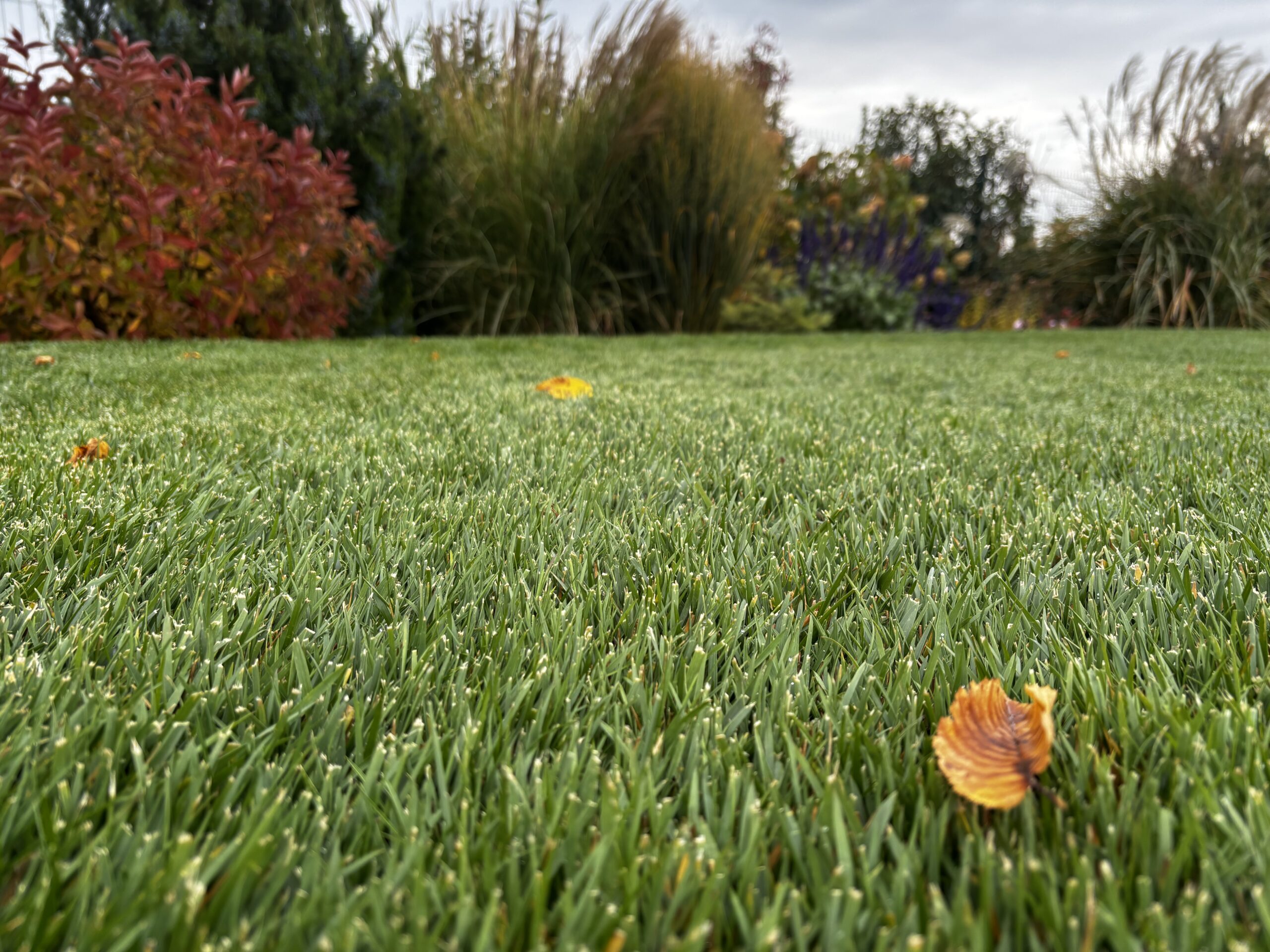 Téliesített gyep: levágva, őszi szervesanyag tartalmú gyeptrágyával megszórva