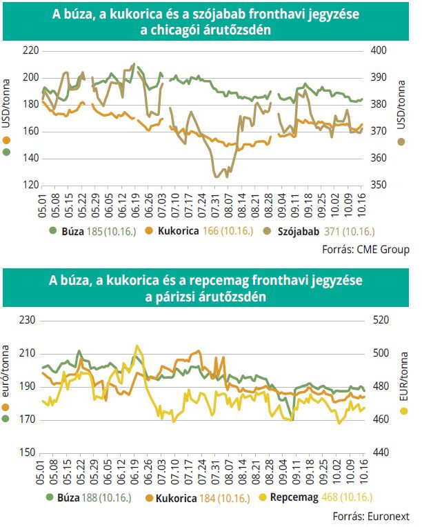 A chicagói árutőzsdén (CME/CBOT) a búza legközelebbi lejáratra szóló jegyzése 1 dollárral 185 dollár/tonnára mérséklődött, míg a kukoricáé 1 dollárral 166 dollár/tonnára nőtt a megfigyelt időszakban. A szójabab fronthavi kurzusa 370–376 dollár/tonna között alakult ugyanekkor. A párizsi árutőzsdén (Euronext/MATIF) a búza és a kukorica jegyzése a legközelebbi lejáratra vonatkozóan egyaránt 3 euróval csökkent a vizsgált periódusban, az előbbit 188 euró/tonnáért, az utóbbit 184 euró/tonnáért jegyezték. Ezzel egy időben repcemag novemberi tőzsdei elszámolóára 4 euróval 468 euró/tonnáig mérséklődött.