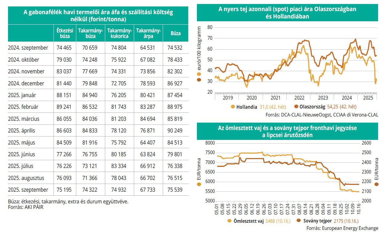 A lipcsei árutőzsdén (EEX) az ömlesztett vaj legközelebbi határidőre szóló jegyzése 33 euróval 5488 euró/tonnára csökkent október 9. és 16. között, míg a sovány tejporé 2175 euró/tonnán stagnált ugyanekkor. Az olaszországi Veronában a nyers tej azonnali (spot) piaci ára áfa nélkül, szállítási költséggel a 29–39. hét között 14,25 euróval esett, a 41. héten 0,5 euróval 54,25 euró/100 kilogrammra nőtt, majd a 42. héten nem változott egy hét alatt. Hollandiában a 4,4 százalék zsírtartalmú nyers tej spot piaci ára áfa nélkül, szállítási költséggel a 28–40. hét között 25 euróval csökkent, a 41. héten 5 euróval emelkedett, majd a 42. héten 2 euróval 31 euró/100 kilogrammra mérséklődött.