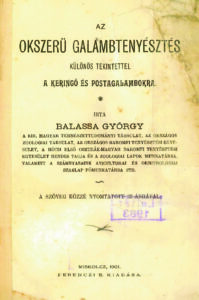 Balassa György jelentette meg Miskolcon Az okszerű galambtenyésztés, különös tekintettel a keringő- és postagalambokra címmel, 1901-ben. Korszakalkotó és úttörő volt saját korában, hazai és európai kitekintésben is.