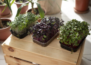Mikrosaláta termesztés – ehhez sekély tálcák, tápanyagdús közeg például kókuszrost, perlit, vagy bio földkeverék és sok fény szükséges. A magokat sűrűn vetjük, eleinte takarjuk, és mindvégig nedvesen tartjuk. Amikor megjelenik az első valódi levél, ollóval szüretelhető. Ebben az esetben pedig csak a levelet fogyasztjuk és használjuk fel.