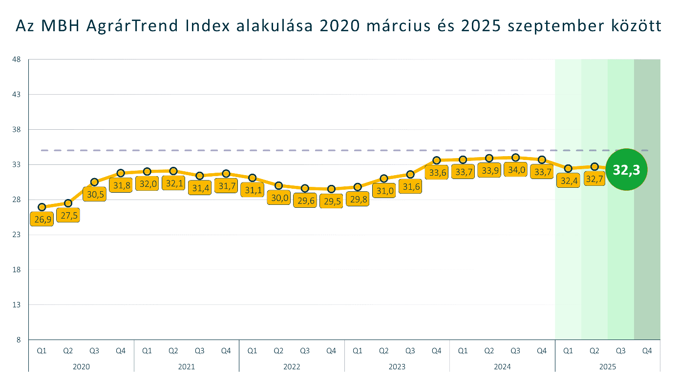 Az ügyfelek, szakmaközi szervezetek és a bank elemzőinek helyzetértékelése alapján készülő, és a hivatalos statisztikákat megelőző agrár-élelmiszeripari bizalmi mutató, az MBH AgrárTrend Index értéke 2025. szeptember végével 32,4 pontot mutatott a 48 pontos skálán, ezzel kismértékben távolodott az egyensúlyi szintnek tekintett 35 ponttól: az előző negyedévi 0,3 pontos emelkedést 0,4 pontos csökkenés követte július és szeptember között. Éves összevetésben ennél nagyobb mértékű, 1,9 pontos csökkenés tapasztalható az indexben, amely így most a 2023 végi, 2024 eleji agrárgazdasági pillanatképhez hasonló értékelést mutat.