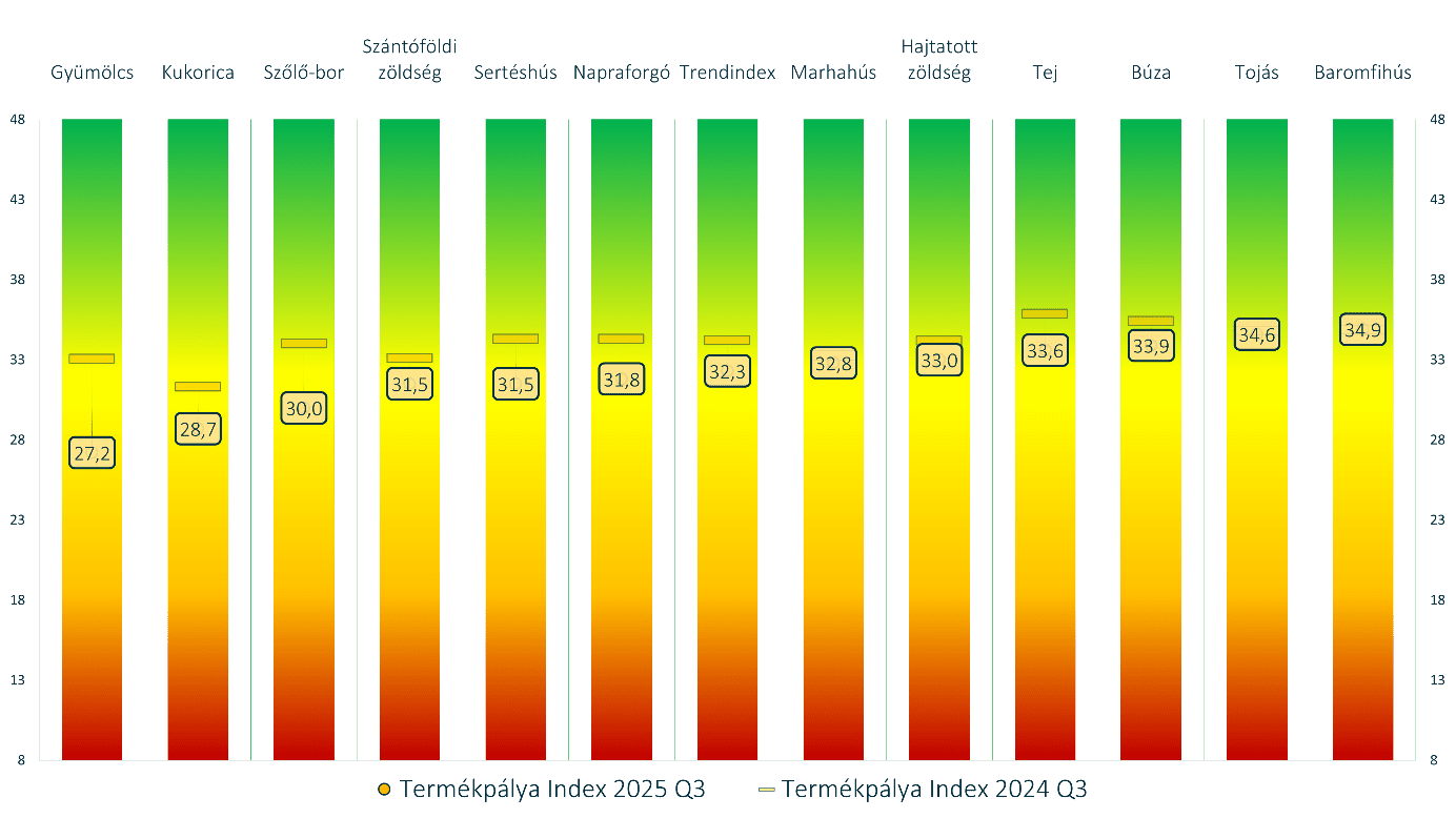 A sertéshús esetében negatív trend indult el: az irányadó külföldi árak 15 százaléknál nagyobb mértékben csökkentek, a forint árfolyama pedig erősödött, így a hazai termelői átvételi árak ötödével csökkentek 2025 harmadik negyedévében, amellett, hogy a takarmányozás költsége nem változott, a malac ára viszont közel harmadával csökkent, ami előrevetíti a hízóár némi csökkenését is. „Ennek a trendnek a hátterében a Kína és az Egyesült Államok közötti kereskedelmi háború, a kínai termelés növekedése, valamint a Brazília és az Európai Unió közötti exportpiaci verseny húzódik meg” – magyarázta Héjja Csaba.