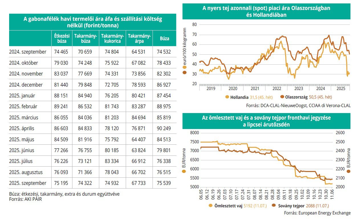 A lipcsei árutőzsdén (EEX) az ömlesztett vaj legközelebbi határidőre szóló jegyzése október 30. és november 6. között 11 euróval 5192 euró/tonnára nőtt, míg a sovány tejporé 2088 euró/tonnán stagnált. Az olaszországi Veronában a nyers tej azonnali (spot) piaci ára áfa nélkül, szállítási költséggel a 29–45. hét között 17,5 euróval 50,5 euró/100 kilogrammra esett. Hollandiában a 4,4 százalék zsírtartalmú nyers tej spot piaci ára áfa nélkül, szállítási költséggel a 28–40. hét között 28 euró/100 kilogrammig csökkent (–25 euró), majd 30–33 euró/100 kilogramm között mozgott. A 45. héten 31,5 euró/100 kilogramm volt.