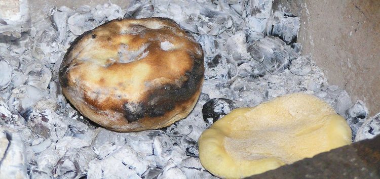 Folytassuk a gyúrást lisztezett felületen, míg sima, rugalmas tésztát nem kapunk. Letakarva meleg helyen legalább 4 órán keresztül kelesztjük, de hagyhatjuk egész éjszakára is. Ezután tépjünk belőle kb. ökölnyi darabokat, nyújtsuk vékonyra, tegyük egy forró hamurétegre, a maradék hamuval pedig takarjuk be.