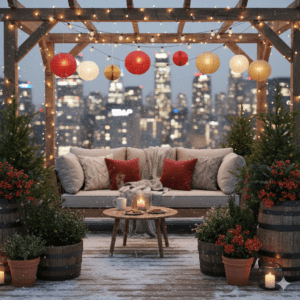 A növények mellett a kiegészítők teszik teljessé a téli balkon és terasz hangulatát. A dézsákban és ládákban lévő növényeket kiegészíthetjük természetes elemekből készült dekorációval, használhatunk fenyőágakat, tobozokat, piros vesszejű som ágakat, mogyoróágakat, bogyós terméseket, amelyeket a ládákba, cserepekbe szúrunk. A földet akár mohával vagy apró kaviccsal is takarhatjuk, a rendezettebb látvány érdekében. Időnként télen is kiülünk a teraszra kicsit levegőzni, tegyünk ki meleg takarót, puha párnákat. Egy kisebb asztalra állított lámpás és egy bögre forró ital megteremti az igazi téli hangulatot.