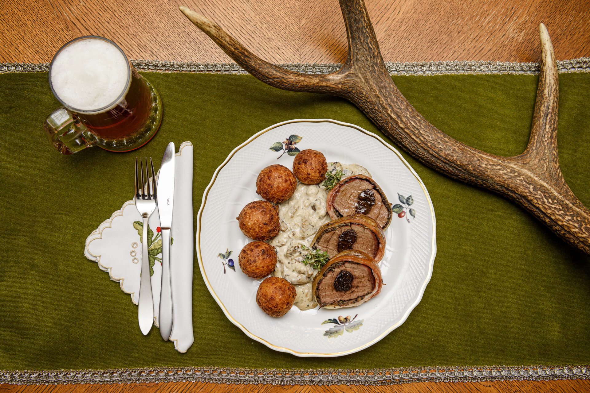 A kis gombócokra gyúrt krumplifánkokat forró olajban kisütjük, addig az apróra vágott, tetszés szerint választott gombákból, tejszínnel összekeverve, mártást készítünk. A szeletekre vágott szarvasgerinc közepébe szilvát töltünk, a hússzeletek széleit a gombamártással megkenjük, majd baconba csomagoljuk, hogy a mártás ne folyjon le az oldaláról. Ezt követően a húst alufóliába tekerjük, alacsony hőfokon a sütőben egy órán át pároljuk, hogy a só, bors, kakukkfű, valamint a gomba és az aszalt szilva ízeit átvegye. Mikor jól megpuhult, az alufóliát levéve további egy órán át alacsony hőmérsékleten átsütjük. Mikor kész, a kisütött krumplifánkkal és gombamártással tálaljuk.
