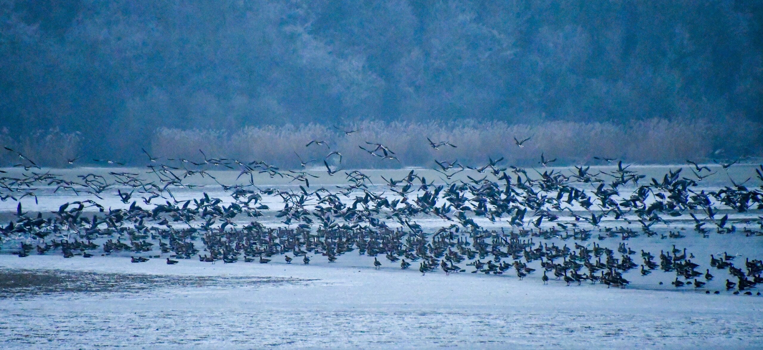 Napfelkelte után a tavon éjszakázó összes madár egyszerre rebben fel és elindulnak élelmet keresni. Eztán a ludak késő délután szállnak le újra a vízre – az esti behúzás is látványos, főleg felhőtlen égbolt előtt. Az ék alakban érkező madarakat a parton felállított távcsöveken és nagyméretű kivetítőn is követhetjük. A több tízezer madár nagy ricsajjal érkezik a vízre, ugyanis leszállás közben aktívan kommunikálnak egymással. Konrad Lorenz etológus, a vadludak viselkedésének híres kutatója, aki bár elsősorban a nyári ludak viselkedését kutatta, elismerte, hogy a vadludak közötti úgynevezett kapcsolattartó hangok (gágogások) kulcsfontosságúak, mert így mindig tudják, merre van fajtársuk, családtagjuk. Zord időjárás, rossz látási viszonyok között hanggal tartják a kapcsolatot egymással, ami biztonságérzetet ad a csapat tagjainak. Lorenz egyébként kutatásai során egy idő után nagyon jól megértette a vadlibákat: tudta, hogy külön hangjelzésük van a gyaloglásra, felrepülésre vagy éppen a leszállásra.