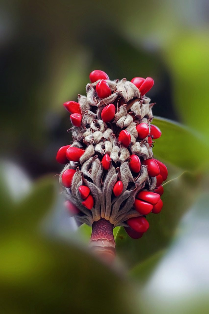Összetett tüszőtermése pirosas, 7-10 centi hosszú, és lapos, piros magok bújnak meg benne, pontosabban potyognak ki a kinyíló magtokokból.