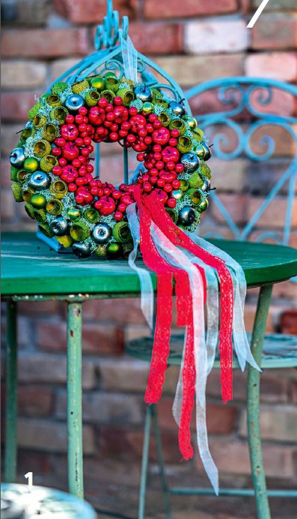 A karácsonyi ünnepkör hagyományos, máig sokak által választott színpárosa a zöld és a vörös. Természetesen ezeket a színeket sokféleképpen lehet használni, a variációk és az anyagok sora szinte végtelen. Ennél a modern kopogtatónál szempont volt a tartósság és a kültéri használat. A koszorú szélén zöld és kékes árnyalatú bell cupot, műanyag gömböket, festett hungarocell almákat, és térkitöltő anyagnak jégkék izlandi zuzmót használtam. A koszorú belső felére pedig izzóvörös műanyag termések kerültek. A zárt korongformát a díszítéshez illő világoskék organza- és vörös csipkeszalagokkal tettem lágyabbá, így egy bejárati ajtón a szellő játékossá varázsolja a koszorút.