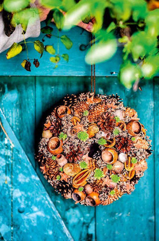 Trendek jönnek, trendek mennek, így van ez a virágkötészetben is. Az emberek természet és természetesség utáni vágya viszont nem változik, és még mindig nagyon sokan keresnek kifejezetten olyan kompozíciókat, amelyek vadvirágokból, kertből szedett virágokból, termésekből és zöldekből készülnek. Klasszikusnak számítanak az erdei jellegű, főleg festetlen barna és zöldes árnyalatú anyagokból készült kopogtatók. Kis rózsatobozt, kínai mézesfa termését, eukaliptusztermést, ezüstfenyőtobozt, natúr terméseket (bell cupot és mike-termést) használtam fel, és pici kültéri kövirózsákkal színeztem zöldesre ezt a barna színű koszorút.
