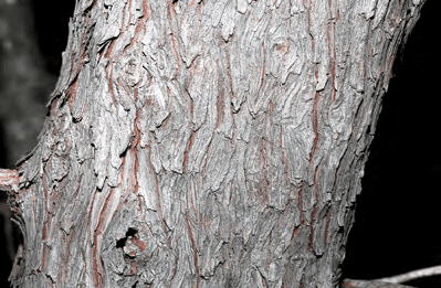 Idősebb korában barna kérge nagy, hosszanti foszlányokban válik le, fiatal, pirosló hajtásai mirigyszőrösek. 5-10 cm hosszú, örökzöld, fénylőn sötétzöld, fogazott szélű levelei szórt állásúak, elliptikusan hosszúkásak, ovális-lándzsásak, mindkét oldalukon kopaszok. A levélnyél pirosló, finoman szőrözött.