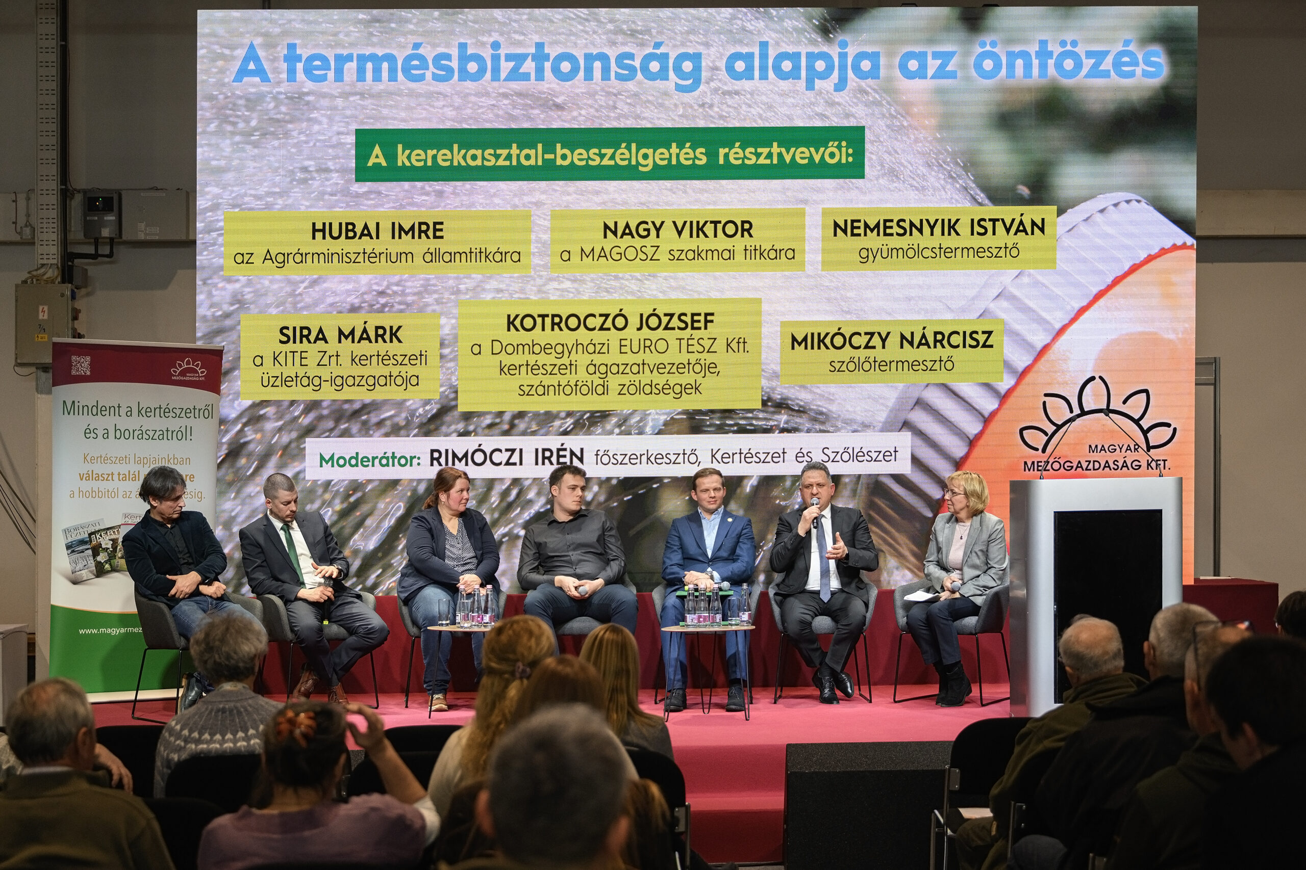 Kiadónk, a Magyar Mezőgazdaság Kft. szervezett kerekasztal-beszélgetést a kertészeti kultúrák öntözéséről az AGROmashExpo kiállításon. Résztvevői intenzív gazdálkodást folytató termesztők és az ágazatirányítás vezetői: Hubai Imre, az Agrárminisztérium mezőgazdaságért felelős államtitkára; Kotroczó József, a Dombegyházi EURO Tész kertészeti ágazatvezetője, Mikóczy Nárcisz szőlőtermesztő, Nagy Viktor, a MAGOSZ szakmai titkára, Nemesnyik István gyümölcstermesztő és Sira Márk, a KITE Zrt. kertészeti üzletág-igazgatója. A beszélgetést Rimóczi Irén, a Kertészet és Szőlészet főszerkesztője vezette.