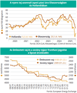Hollandiában a 4,4 százalék zsírtartalmú nyers tej spot piaci ára áfa nélkül, szállítási költséggel a 2025. 28–52. hét között 48,5 euróval 4,5 euró/100 kilogrammra csökkent, majd a 2026. 4. hetéig 11 euróval 15,5 euró/100 kilogrammra emelkedett.