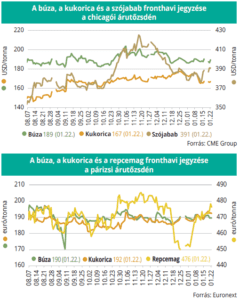 A párizsi árutőzsdén (Euronext/MATIF) a búza jegyzése a legközelebbi lejáratra vonatkozóan alig változott a megfigyelt időszakban, 190 euró/tonna volt, miközben a kukoricáé 2 euróval 192 euró/tonnára nőtt. A repcemag februári tőzsdei elszámolóára 5 euróval magasabb, 476 euró/tonna volt január 22-én.