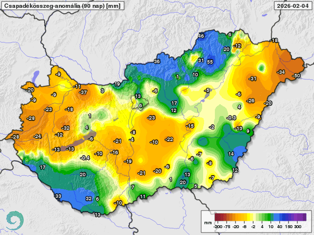 Az elmúlt 90 nap csapadékmennyiségében viszont hazánk nagyobb részén hiány mutatkozik, ami az északnyugati, a középső és az északkeleti országrészben a 20-50 mm-t is eléri. A fölső 50 cm-es talajrétegben a középső és északkeleti országrészben van nedvességhiány, másfelé a telített állapot a jellemző.