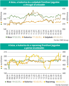 A párizsi árutőzsdén (Euronext/MATIF) a búza jegyzése a legközelebbi lejáratra vonatkozóan 4 euróval 194 euró/tonnára nőtt a vizsgált periódusban, miközben a kukoricáé változatlanul 192 euró/tonna volt február 5-én. Ezzel egy időben a repcemag májusi tőzsdei elszámolóára 473–489 euró/tonna között mozgott, február 5-én 486 euró/tonnáért jegyezték.