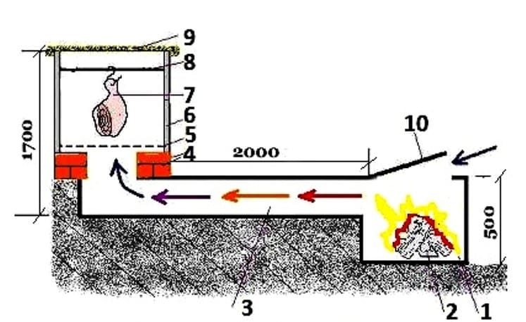 A feltüntetett tervrajz alapján jól látható, hogy nem nagy ördöngösség a házi füstölő kiépítése.  Jelmagyarázat: tűztér (1), fa (2), kémény (3), téglafal (4), fémrács (5), fából, vagy fémből készült kamra (6), felakasztott húsok, sonkák, kolbászok, stb. (7), tartórudak (8), háló (9), kisajtó (10).