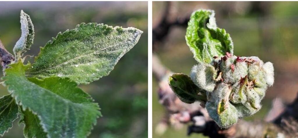 A fertőzött rügyekből kibújt leveleken látható „lisztes” gombatelepekről már most is terjednek, szóródnak a lisztharmat spórái (konídiumai) és fertőzik az egészséges leveleket.